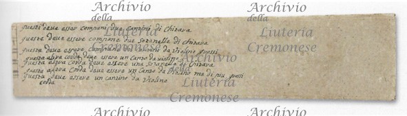 - (right) questi deve esser compani due cantini di chitara / queste deve essere compane due sotanelle di chitara / queste deve essere un canto da ciolino / questa altra corda deve essere un canto da violino / questa altra corda deve essere una sotanella di chitara / questa altra corda deve essere un canto da violino ma di più grossi / questa corda deve essere un cantino da violino; (back) Misura della longezza et largezza del / manico della xxxx Chitara Tiorbata