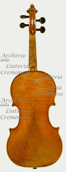 The front is of medium-grained spruce. The back is two-piece of maple, cut on the slab, of irregular medium curl, descending to the right. The ribs are four pieces of maple. The scroll is of faint-curly maple. The varnish is golden-brown on a golden base.
