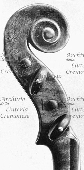 Soundboard of spruece to very fine vein at the center, which widens towards the flanks. Back of one piece of curly maple with medium curl descending to the right. Bands and scroll of wood similar to that of the back. Red-brown varnish on a golden ground.