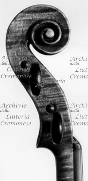 Back of one piece of curly maple with large wavy curl almost horizontal. Scroll of modern German violin making.