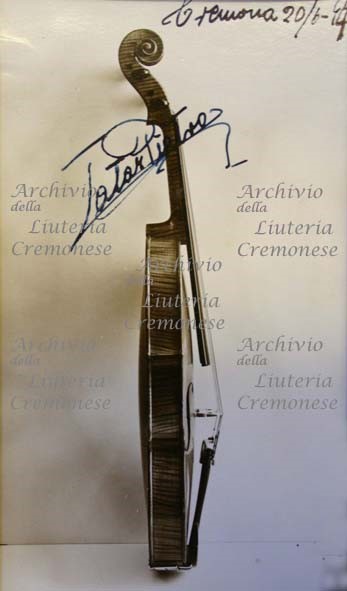 Exhibited by three signed and dated photographs, 20/6/1947, has the back in two pieces of maple with medium-sized curl maple, glued to a light herringbone with vertex at the top.