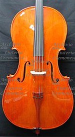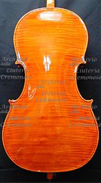 Soundboard of two-piece of spruce with medium grain that extends to the flanks. Back of one-piece of curly maple on medium almost horizontal curl. Yellow-brown varnish.