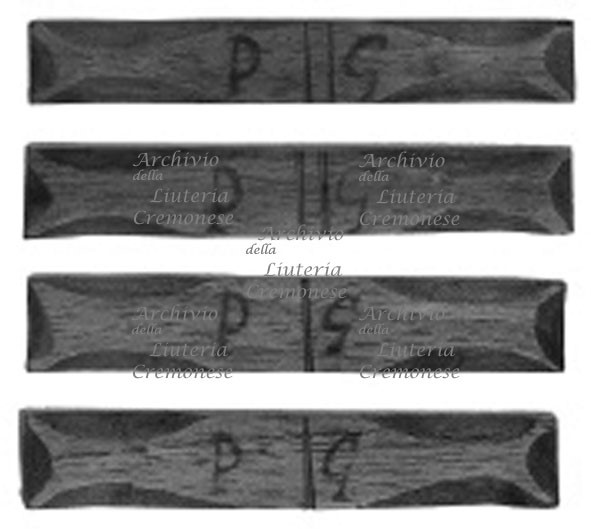 Le quattro controparti erano utilizzate, assieme a dei pioli, per stringere con spago le fasce agli zocchetti durante l'incollaggio. La lettera scritta a inchiostro riguarda la forma corrispondente.