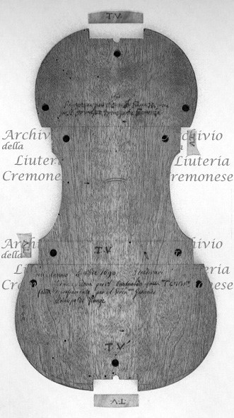 - (in alto) 1690 / Forma nova per il contraldo Fatta Ha posta / per il ser.mo Gran. Principe De Fiorenza; (in basso) T.V. / dell'Antonio 4 8bre 1690 Stradivari / forma Nuova per il (cancellato: Contraldo fatta) Tenore / fatta espressamente per il Seren.mo Grande / Principe di Firenze / T. V.