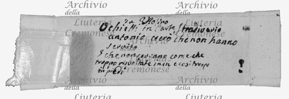 - 'Occhietti da Violino in carta Stradivario / Antonio però che non hanno / servito / p[er]che non seriano come che / troppo riscoltate in sù e così troppo / in piedi' (autografo di Cozio di Salabue)