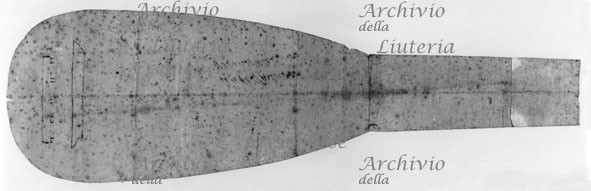 Ricavato da un foglio di carta, ha la forma del corpo e del manico e, sul rovescio, ha disegnato il ponticello e, sotto, la sua altezza con la divisione a 5 cori (4 doppi e 1 semplice).