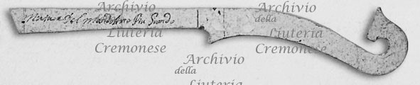 Sul cavigliere ha segnati i fori dei piroli. Nel dritto è segnata la posizione del capotasto e nel rovescio due misure a compasso.