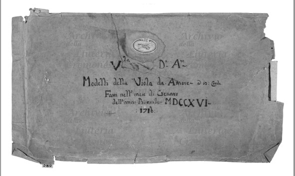 - 'V[io]la Da A[mo]re / Modelli della Viola da Amore - a 12 Corde / Fatti nell' mese di Genaro / dell'anno Bisestile MDCCXVI - 1716' (autografo di Omobono Stradivari)