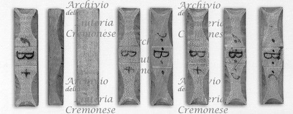 Le otto controparti erano utilizzate, assieme a dei pioli, per stringere con spago le fasce agli zocchetti durante l'incollaggio. La lettera scritta a inchiostro riguarda la forma corrispondente.