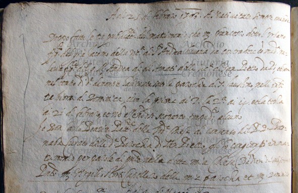 Doppo fatte le tre publicat[io]ni del matrimonio, che Ms Francesco detto Urbano fig[lio]lo del già Jacomo della vic[inanz]a di S.to Andrea haveva da contrahere co[n] Mad.a Valeria fig[lio]la del q[uondam] Ms. Andrea degli Amati della Vic[inanz]a di San Pietro da Po', et hora nel tempo di d[ett]e denontie habitante sotto la parochia di S. Faustino, nelli inf[rascrtt]i tre giorni di Domenica, cioè la prima dì 7. la 2.a ai 14. et la terza ai 21 di febraro, et no[n] essendosi scoperto imped[imen]to alcuno, Io Don Carlo Boarini Rett[o]re della sod[ett]a Chiesa di consenso del D. D. Barnaba Curato della d[ett]a Parochia di San Pietro, gli ho congionti in matrimonio per parole di p[rese]nte nella detta mia Chiesa, P[rese]nti ms. Virgilio Storti Cappellaro della mia parochia, et Ms. Dominico Ba[r]diere del Mo[n]ferrato.