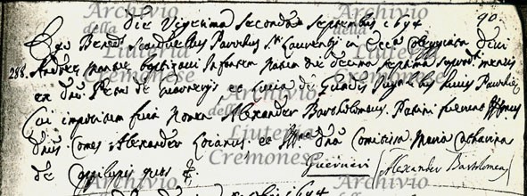 Ego Bened[ict]o Scandaellus Parochus S[anc]ti Laurentij in Ecc[lesi]a Collegiata Divi Andreae Mantuae baptizavi Infantem Natum di Decima septima soprad[ic]ti mensis ex Dom[inus] Petrus de Guarnerijs, et Lucia de Guadis Jugalibus huius Parochiae Cui impositum fuit nomen Alexander Bartholomeus. Patrini fuerunt Ill[ustrissi]mus Dom[inus]s Comes Alexander Loianus, et Ill[ustrissi]ma D[omi]na Comitissa Maria Catharina de Cappilupis quem pro fide