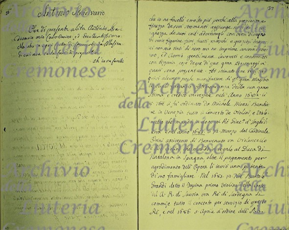 Regnante di Modena un Violoncello, la quale volle, che Antonio glielo portasse in persona per conoscerlo di vista, a cui oltre il pagamento li dono 30. Doppie. Nel 1686. 22 Agosto dal Marchese Michele Rodeschini li fu ordinato un Violoncello per la Corte di Spagna e nel 1687. 7 Agosto Don Agostino … Generale della Cavalleria dello Stato di Milano mentre era d’Alloggio a Cremona volle che li facesse un Violoncello. Nel 1690 19.Settembre ricevette Antonio la seguente lettera dal Marchese Bartolomeo Ariberti.