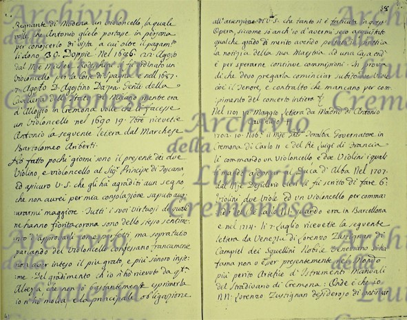 - 10 Novembre il Marchese … Toralba Governatore in Cremona di Carlo II e del Re Luigi di Francia li commando un Violoncello, e due Violini i quali li mandò a donar al Duca d’Alba. Nel 1707 dal Marchese Desiderio Cleri li fu scritto di fare 6 Violini, due Viole, ed un Violoncello per commando del Re Carlo III. quando era in Barcellona e nel 1714. Li 7 Luglio ricevette la seguente lettera da Venezia di Lorenzo Zustignan di Campiel dei Squellini Nobile Veneziano: si hà fama non v’esser presentemente nel Mondo più perito Artefice d’Istrumenti Manoali del Stradivario di Cremona. Onde è che io Nobile Lorenzo Zustignan desideroso di continuar