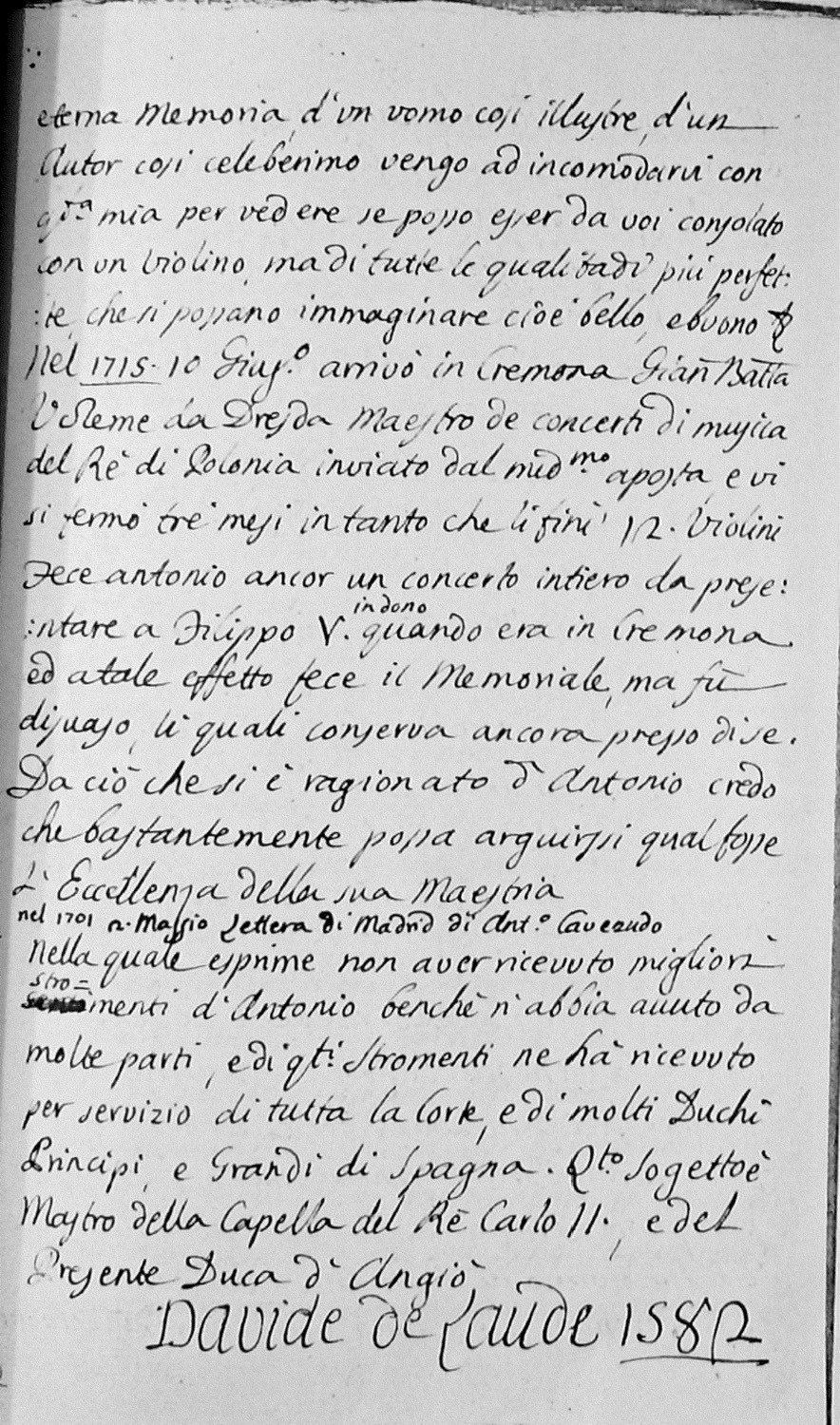 eterna Memoria d’un uomo così Illustre d’un Autor cosi celeberrimo vengo ad incomodarvi con questa mia per vedere se posso esser da voi consolato con un Violino, ma di tutte le qualità di più perfette che si possano immaginare cioè bello e buono. In fede