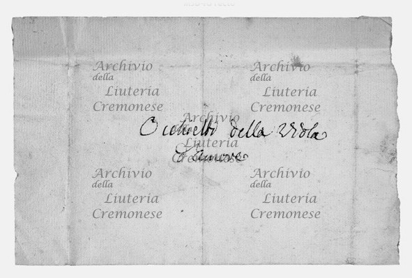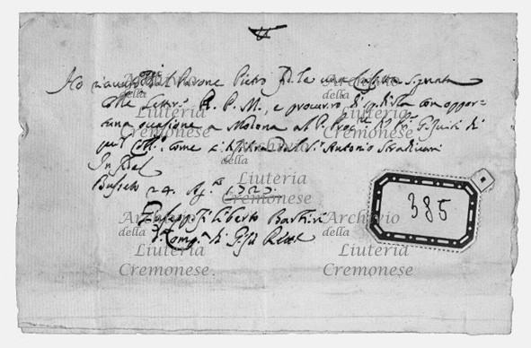 'Ho ricevuto oggi dal Barone Pietro Fedele una Cassetta Segnata / colle lettere R.P.M., e procurerò di spedirla con oppor= / tuna occasione a Modena al P. Proc[urato]re de P[ad]ri Gesuiti di / quel Coll[egi]o, come si desidera dal S[igno]r Antonio Stradivari / In fede / Busseto 24 Ag[os]to 1727 / Giuseppe Filiberto Barbieri / d[ell]a Comp[agni]a di Gesù Rett[o]re'