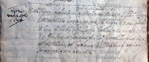 Adì 6 Dicembre 1696 Nicolò Amati figliuolo di Mes. Hieronimo Amato e di Mad. Laura Lazzarini sua legitima consorte che nacque li 3 sudetto a hore … fu da me infrascritto Rector battezzato nella propria chiesa di S. Faustino. Compare fu Jacomo Bissolati della Vicinanza di S. Nazzario et Comara la Sig. Anastasia Castellana Santini della mia Parrocchia.