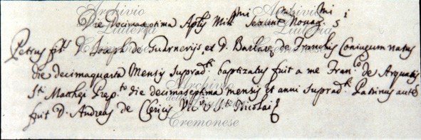 Petrus fil[ius]s D[omini] Joseph de Guarnerijs et Barbarae de Franchis Coniugum natus die decimaquarta Mensis suprad[ict]ti baptizatus fuit a me Frac[esc]o de Arquatis S[anc]ti Matthei Prep[osi]to die decimaseptima mensis et anni suprad[ic]ti. Patrinus antem fuit D[ominus] Andreas de Clericis Vic[in]iae S[anc]ti Nicolai.