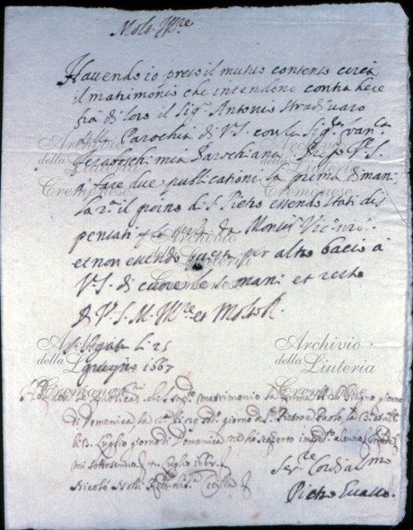 Havendo io preso il mutuo concenso circa il matrimonio che intendono contrahere fra di loro il Sig[nor]r Antonio Stradivaro della Parrocchia di V[ostra] S[ignoria] con la Sig[no]ra Fran[ces]ca Feraboschi mia Parochiana. Prego V[ostra] S[ignoria] a' fare due publicationi. La prima dimani, la 2.a. il giorno di S. Pietro essendo stati dispensati per la terza da Monsig[nor] Vic[a]rio et non essendo questa per altro bacio a V[ostra] S[ignoria] di cuore le s[ue] mani e resto di V[ostra] S[ignoria] M[olto] Ill[ust]re et Molto R[everenda]