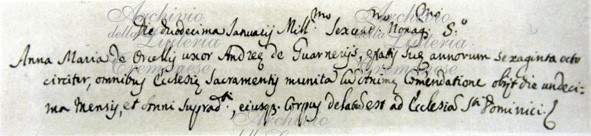 Anna Maria de Orcellis uxor Andrete de Guarnerijs, aetatis suae annorum sexaginta octava circiter, omnibus Sacramentis munita[m] cu[m] Anima[m] Com[m]ndatione obijt die undecima mensis, et anni suprad[dicti], eiusque corpus delatu[m] est ad Ecclesia[m] S[anc]ti Dominici etc