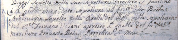 Dato sepoltura al fu S[igno]re Gio[vanni] Batt[ist]a Stradivario sepolto nella Cappella del Ros[ari]o nella sepoltura del S[igno]re Francesco Vilani apresso a quella del fu S[igno]re Marchese Prevosto Rota Parochia S. Mateo
