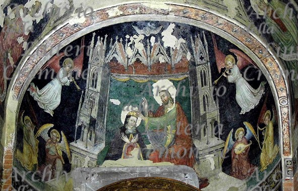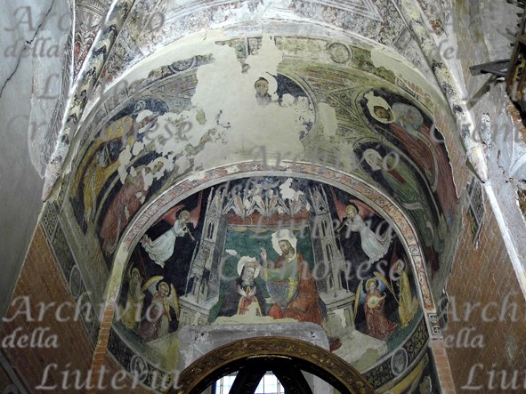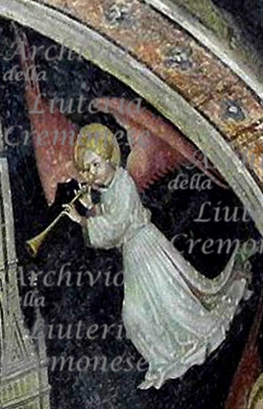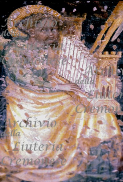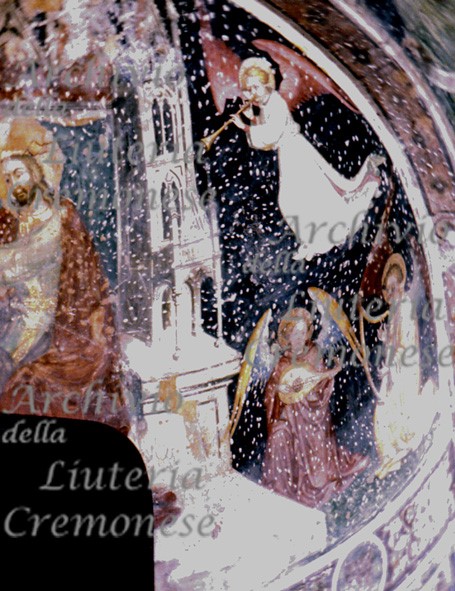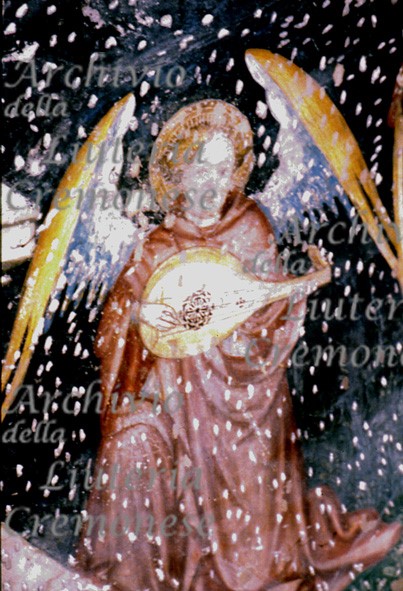 Liuto a 4 cori (3 doppi e cantino semplice) suonato col plettro. Ha al centro della tavola una grande rosetta traforata e verso il manico un intarso romboidale.