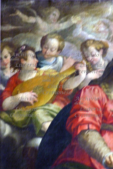 A sinistra un angelo suona un liuto rinascimentale a sei cori (il cavigliere è parzialmente coperto dal braccio di un angelo che gli sta a fianco); a destra un angelo in primo piano suona una viola da gamba tenore a sei corde che ha forma con CC e punte, fori di risonanza ad f e cavigliere a falce; dietro ques'angelo, un'altro angelo suona un cornetto a bocchino.
