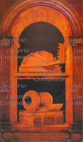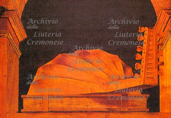 Il liuto è riprodotto con realismo, col guscio formato da 9 doghe concave, posato con la tavola armonica all'in giù sopra un libro nel piano superiore d'uno stipo o finestrella ad arco; la tarsia mostra altresì il manico e il cavigliere rivolto all'osservatore (mancante della traversa apicale forse perduta in un restauro) con 11 piroli a testa cuoriforme, per un'armatura a 6 cori (5 doppi e il cantino semplice). Nel piano inferiore sono posati due libri, con sovrapposto - rovesciato su un fianco - un lume a candela e inframezzato un foglio di carta.