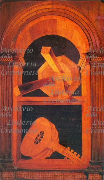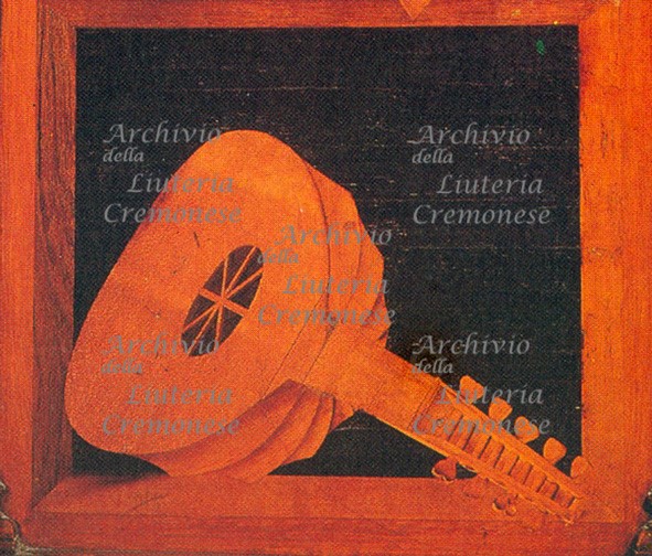 Il liuto è riprodotto realisticamente, col guscio formato da 9 doghe concave, posato diagonalmente nel piano inferiore d'uno stipo o finestrella ad arco; la tavola armonica è munita del foro armonico decorato da linee incrociate che formano 8 spicchi ma priva del ponticello; ben delineati sono invece il manico e il cavigliere rivolto all'osservatore con 9 piroli a testa cuoriforme, per un'armatura a 5 cori (4 doppi e il cantino semplice). Nel piano superiore è posato sul fianco uno sgabello a tre gambe.