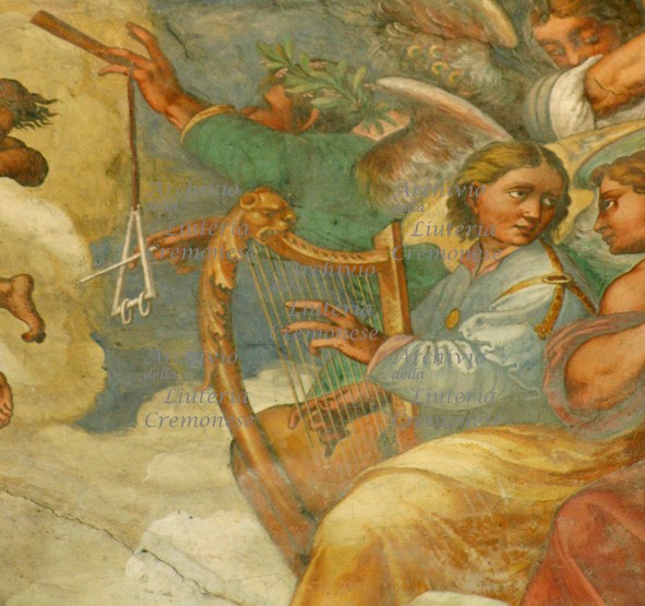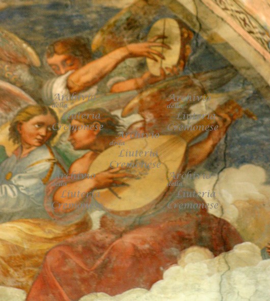 Viola a 3 corde: Lo strumento ad arco, armato con tre corde, è suonato a spalla dall'angelo musicante; è parzialmente coperto dall'angelo organista, e si vede soltanto il corpo dal profilo ovale sciancrato sui fianchi da due ampie CC; i fori di risonanza della tavola armonica sono a C, il ponticello a sgabello e la cordiera trapezoidale; le fasce sono perpendicolari alla tavola e al fondo privi di bordi sporgenti.