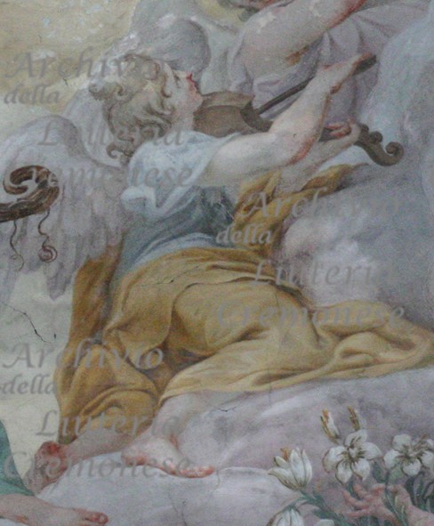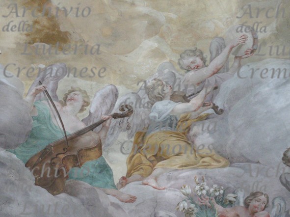 Bassetto di viola da braccio a 4 corde: forse avrebbe dovuto essere un violoncello, ma il corpo è disegnato approssimativamente e mostra sulla tavola due fori di risonanza di una strana forma a graffa. Anche il ponticello è di forma inusuale. Il cavigliere a voluta termina con una esagerata forma a falce. La mano sinistra del suonatore è disegnata in una posizione innaturale che fa apparire la tastiera che la attraversa.