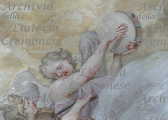 Tamburello: lo strumento è disegnato con precisione ed ha inseriti nella fascia dei piccoli cembali, ma la mano che lo tiene attraversa la fascia.