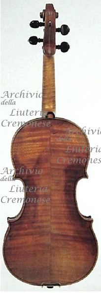 Tavola armonica posteriore d'origine francese. Fondo in due pezzi d'acero riccio a marezzatura medio-larga, incollati a spina di pesce con apice in alto. Fasce d'acero riccio a marezzatura stretta. Testa d'acero liscio. Vernice rosso bruna su fondo dorato.