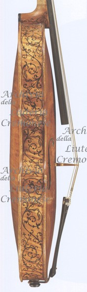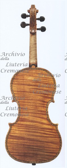 Tavola armonica in un pezzo d'abete che si allarga verso il lato degli acuti, orlata a intarsio di losanghe e cerchietti d'avorio in stucco nero. Fondo in un pezzo d'acero riccio a marezzatura larga discendente verso destra, orlato a intarsio di losanghe e cerchietti d'avorio in stucco nero. Fasce e testa decorate da tralci vegetali incisi e riempiti di stucco nero.