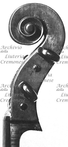 Fondo in due pezzi a debole marezzatura stretta, incollati a spina di pesce con apice in alto. Testa di legno di pero. Manico originale.