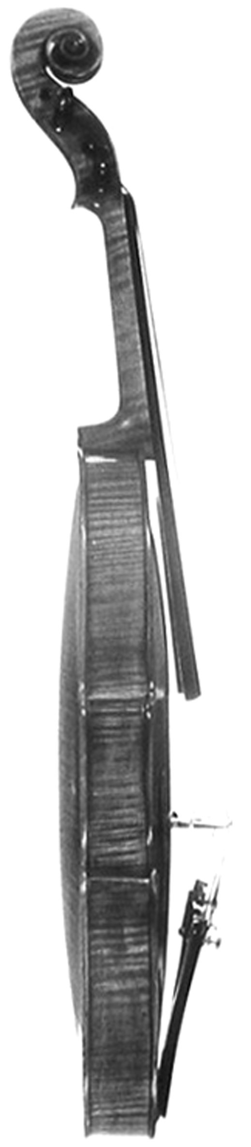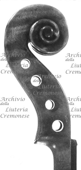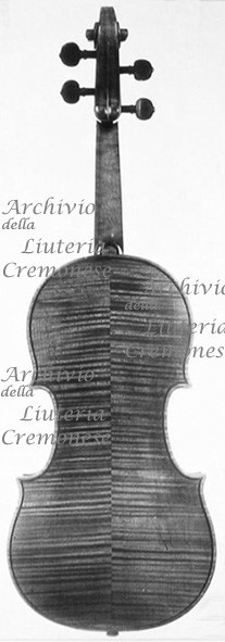 Fondo in due pezzi d'acero riccio a marezzatura media regolare, incollati a leggera spina di pesce con apice in alto. Fasce di legno simile a quello del fondo.