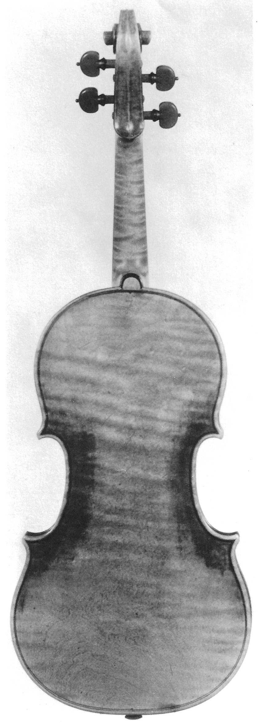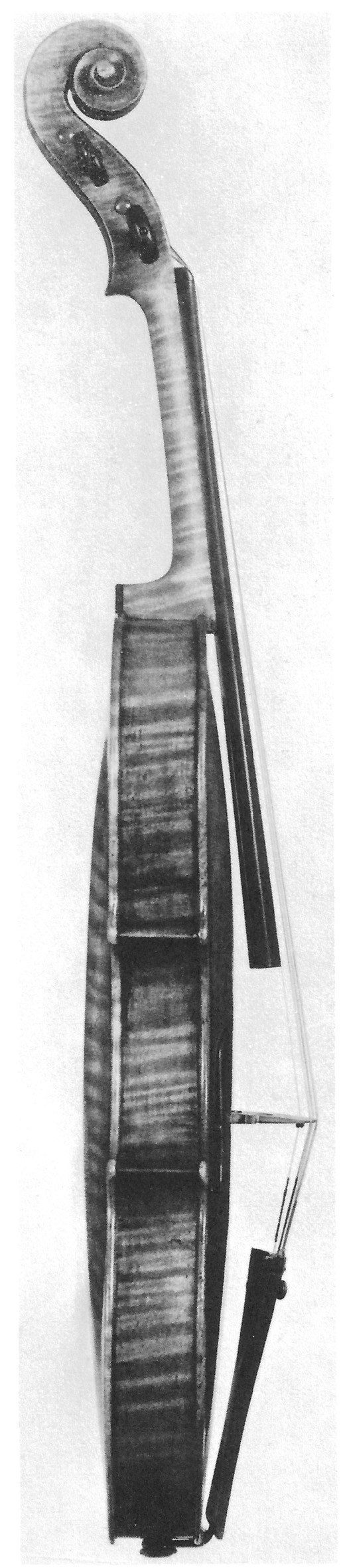 Tavola armonica d'abete a vena stretta. Fondo in un pezzo d'acero riccio a marezzatura media-larga discendente verso destra. Fasce d'acero a marezzatura larga. Testa non originale, forse di G. Rocca (Hill 1929). Vernice rossa-bruna.