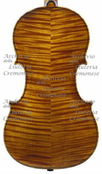 Fondo in due pezzi d'acero riccio a forte marezzatura media, incollati a spina di pesce con vertice in basso.