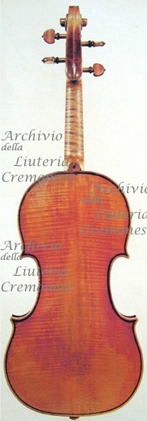 Fondo in due pezzi d'acero campestre a marezzatura fine, incollati a spina di pesce con apice in alto. Fasce dello stesso legno del fondo.