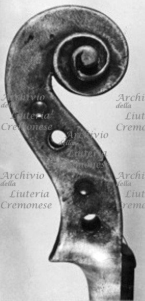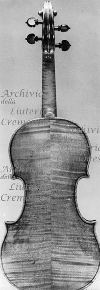 Tavola armonica d'abete a vena regolare che si allarga verso i fianchi. Fondo in due pezzi d'acero riccio a marezzatura media-larga, incollati a spina di pesce con vertice in alto. Fasce di legno simile a quello del fondo. Testa forse non originale, attribuibile a Giuseppe G. Battista Guarneri. Vernice rossa intensa.