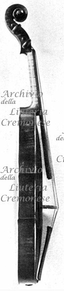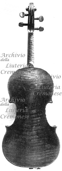 Fondo in due pezzi d'acero riccio a marezzatura media, incollati a spina di pesce con vertice in basso. Vernice ambra-dorata.