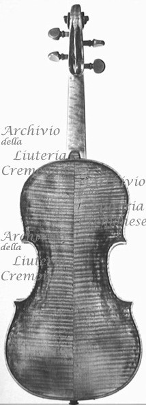 Fondo in due pezzi d'acero riccio a marezzatura media-fine, incollati a spina di pesce con vertice in basso.