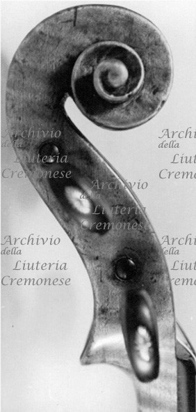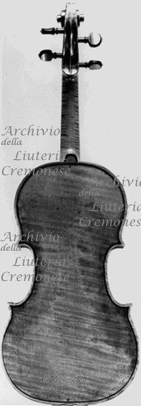 Fondo in un pezzo d'acero riccio a marezzatura larga discendente verso destra. Fasce di legno simile a quello del fondo. Testa di Giuseppe Giovanni Battista Guarneri. Vernice bruna-dorata.