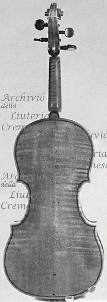 Fondo in due pezzi d'acero riccio a debole marezzatura media, incollati a leggera spina di pesce con apice in alto. Vernice bruna-dorata.