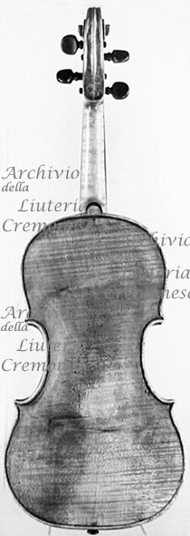 Fondo in pezzo d'acero riccio a marezzatura fine discendente verso sinistra. Fasce di legno simile a quello del fondo. Testa non originale d'acero riccio a marezzatura debole. Vernice arancio-bruno-dorata su fondo dorato.
