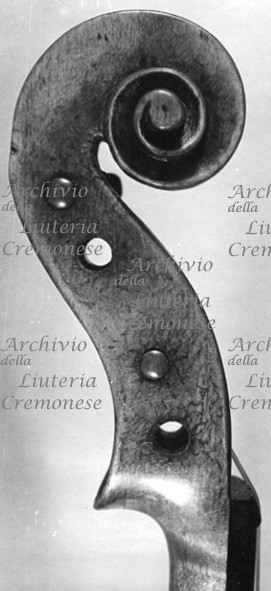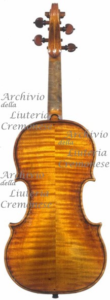 Fondo in due pezzi d'acero riccio a marezzatura ampia, incollati a leggera spina di pesce con apice in alto ma quasi orizzontale.