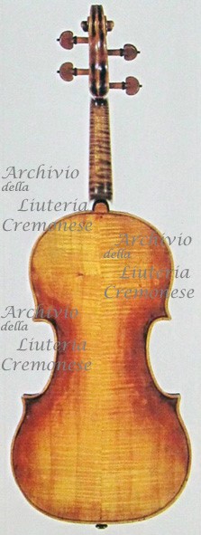 Fondo in due pezzi d'acero riccio a taglio radiale e a marezzatura fine, incollati a leggera spina di pesce con apice in alto, con un nodo nel lobo superiore sinistro. Fasce d'acero riccio a debole marezzatura. Vernice rossa-arancio-bruna su fondo giallo.