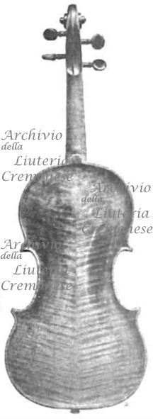 Fondo in due pezzi d'acero riccio a marezzatura larga, incollati a spina di pesce con apice in basso.