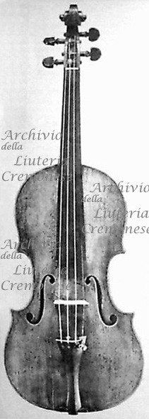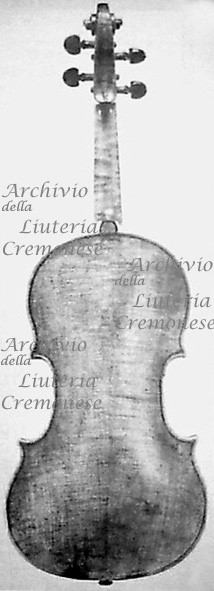 Tavola armonica d'abete a vena fine. Fondo in due pezzi d'acero riccio a debole marezzatura fine orizzontale in alto e a spina di pesce con apice in alto dal centro in basso. Testa originale con voluta piccola e gola aperta. Vernice gialla-bruna, originale sul fondo e sulle fasce.
