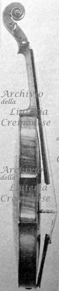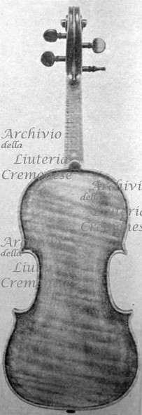 Tavola armonica d'abete marcata la vene di linfa verticali. Fondo in un pezzo d'acero riccio a debole marezzatura larga, discendente verso destra. Vernice rossa-dorata.