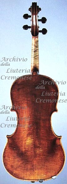 Tavola armonica d'abete a vena media. Fondo in due pezzi d'acero riccio a marezzatura media-stretta, incollati a spina di pesce con apice in alto. Fasce e testa di legno simile a quello del fondo. Vernice rossa-bruna-dorata.